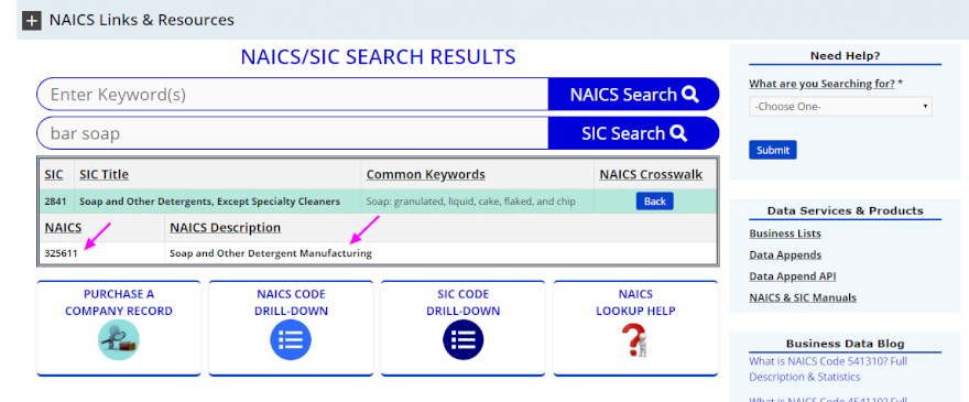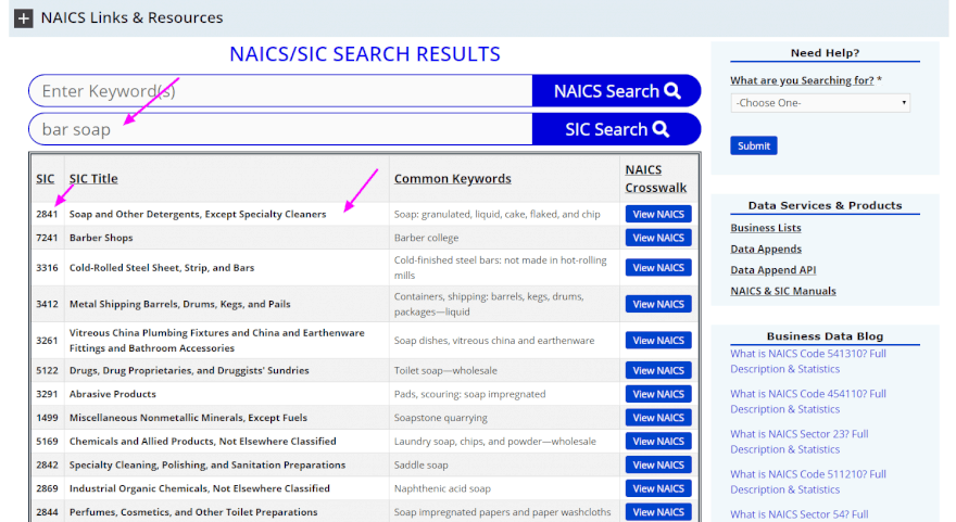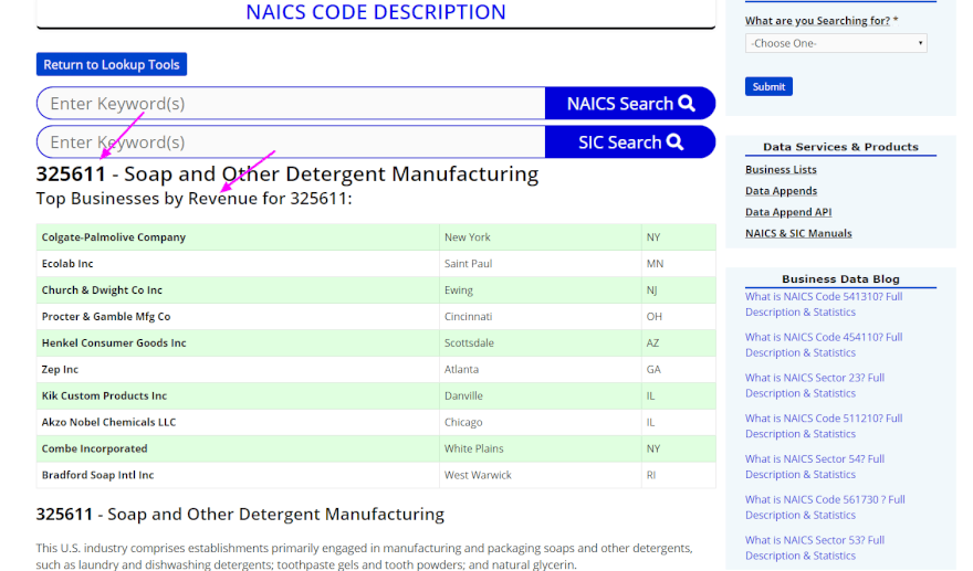 למהדרין: עוד צורת מיון היא NAICS (North American Industry Classification System), והיא מתכתבת עם ה-SIC כך שביחד אפשר ליצור חיפוש מאוד מקיף ויעיל. ניתן לחפש גם את קוד ה-NAICS ולבצע את החיפוש בהמשך לפיו (בהתאם למאגר שדרכו אתם מבצעים את חיפוש המודיעין העסקי). כך נגלה שהקוד של NAICS לסבונים הוא 325611.