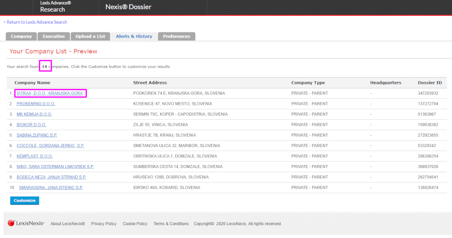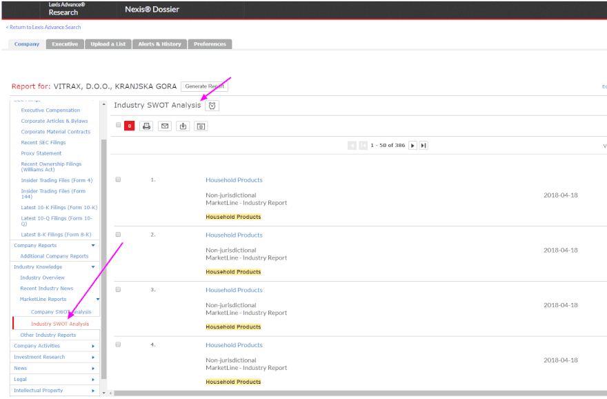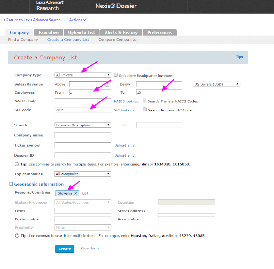מאחר וסיגל מקימה עסק קטן, אין לה כוונה (בשלב הראשון) להתחרות ביצרנים גדולים ומפעלי ענק. היא יודעת שהיא רוצה עסק קטן ובוטיקי, ואין לה רצון להעסיק עשרות עובדים בפס ייצור אלא לכל היותר חמישה עד עשרה עובדים. לכן, נשתמש במנוע שמאפשר לנו לבצע אחזור של מידע רלוונטי בלבד - עסקים פרטיים המעסיקים עד 10 עובדים, שפועלים בשדה שמספרו 2841. יש כל מיני כלים לאחזור המידע הזה, אני משתמש ב-Dossier של Lexis Advance® Research וממשק החיפוש שלו פשוט ואינטואיטיבי: