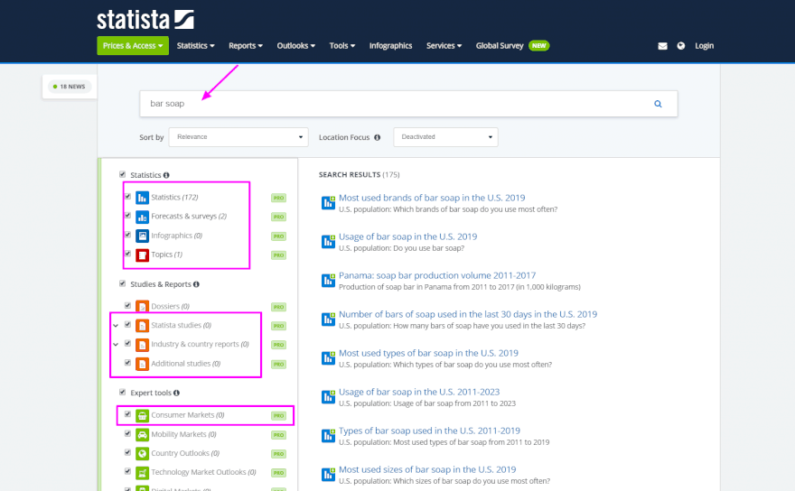 בשלב הזה אנחנו נקפוץ למאגרים מסוג אחר, שבהם נאספים, מנותחים ומוצגים נתונים ומידע על שווקים שונים. אני אוהב את המאגר statista משום שהוא מאפשר לדלות מידע כמו נתונים סטטיסטיים, תחזיות וסקרים, מחקרי שוק, נושאים - ומציג גם מחקרי עומק ואנליזות מתקדמות של השוק.