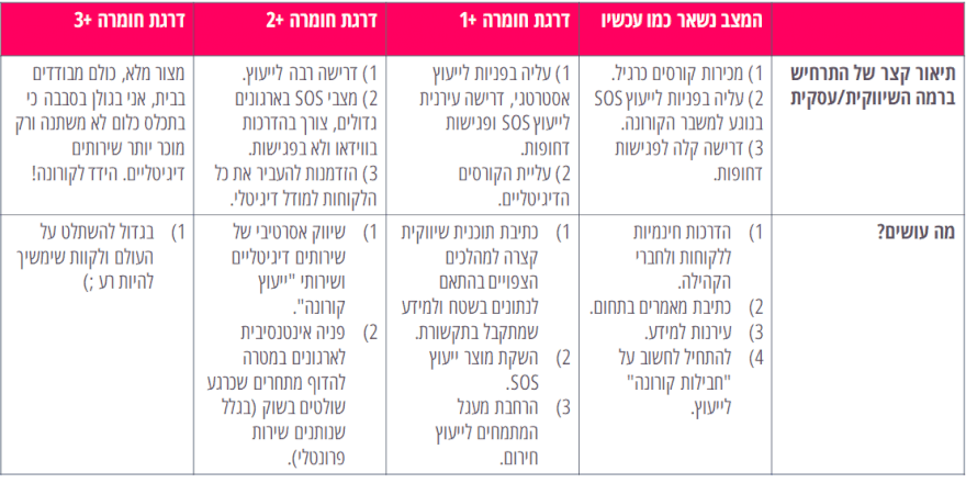 - איזו חלופה דומה ביותר למוצר הנפגע אפשר להציע לקהל? לדוגמה - אם מבטלים כנס בחו"ל, אפשר להציע אלטרנטיבה בארץ או מפגש וירטואלי.