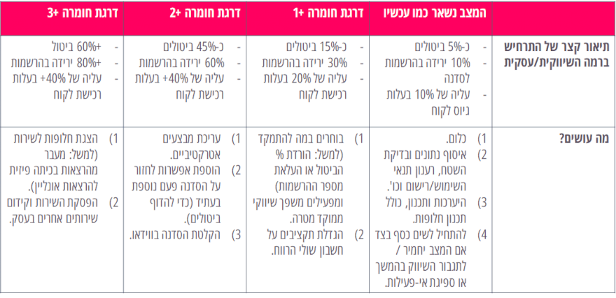 בטבלה שלי כתבתי מדדים כמותניים - אותם הזכרתי קודם - ביטולים, ירידה בהרשמות, עליה במחיר גיוס לקוח. ציינתי בכל סעיף מה הערך שאני צופה, כדי לדעת שאנחנו במצב של +1 או +2. אם אני מודד את הנתונים (לפי הטבלה הקודמת, זוכרים?) ורואה שיש לי 15% ביטולים - זה סימן שאני כבר בדרגת חומרה+1 ושעליתי מדרגה בסיכון לעסק שלי.
