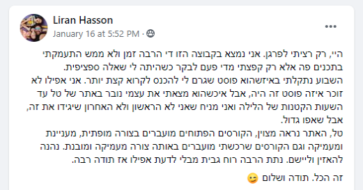 הנה דוגמה למשוב אחד שנכתב בקהילה שלי בפייסבוק, והוא מדגים את התהליך שעבר הלקוח במשך תקופה ארוכה, תוך חשיפה לתכנים שלי ולבסוף גם רכישה והמלצה פומבית כייפית ומחממת לב (תודה לירן!) -