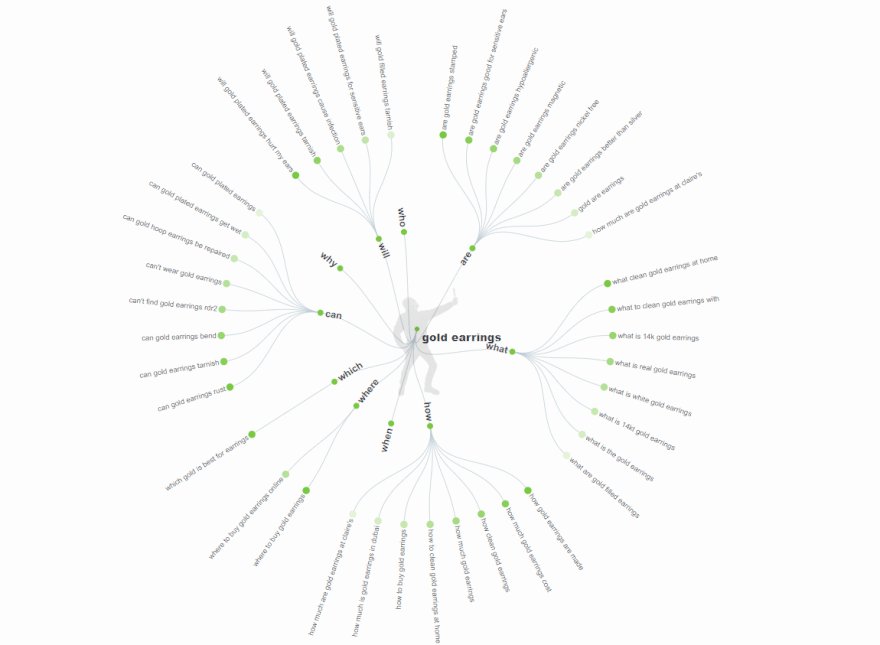 לדוגמה, אם נבדוק בטאב של השאלות לאחר שנחפש את הביטוי "עגילי זהב", נמצא שם שאלות כמו "האם עגילי זהב הם היפואלרגיים", "האם עגילי זהב מחלידים", "האם עגילי זהב יכולים להתעקם", "כמה עולים עגילי זהב", "איך לנקות עגילי זהב", "האם עגילים בציפוי זהב יפגעו לי באוזניים", "האם עגילי זהב גורמים זיהום" ועוד.