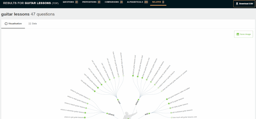 בחלק העליון של המסך, הממשק מקבץ עבורנו את החיפושים לפי סוגים: מילות שאלה, מילות יחס, השוואה, סידור לפי הא"ב וביטויים קשורים. בכל אחת מהקטגוריות נמצא את הביטויים השכיחים ביותר בחיפושים והם מאותתים למנוע החיפוש (כמו גם לכלי הזה, ולנו, כמשווקים שעושים שימוש במידע) שהאנשים מחפשים מידע ספציפי בנוגע לשימושים במילת המפתח שהוקלדה.