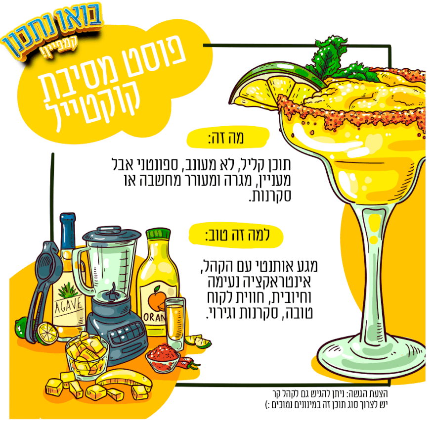 וכעת תורכם: כתבו פוסט מסיבת קוקטייל ופרסמו אותו בתגובות בשרשור המתאים בקבוצה. לחיים! ?
