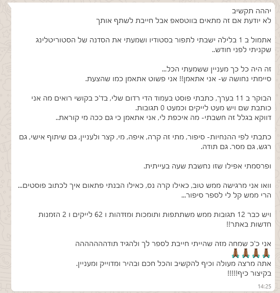 אני מקבל גם הרבה מאוד משובים אישיים מתלמידים שרכשו את הסדנה, כתבו תוכן לפי ההדרכה וקיבלו תוצאות טובות ממה שהם רגילים בדרך כלל. התכנים שתלמדו ליצור בסדנה הם מעוררי עניין ומניעים לפעולה - ויעזרו לכם לשווק ולמכור בכיף. הנה דוגמה אחת מני רבות שקיבלתי :) -