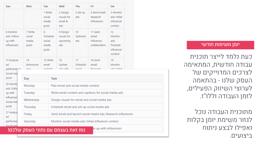 לכן, שילבתי בסדנה גם כלים רבים לכתיבת תוכן שיווקי, בהם תוכלו להשתמש כדי ליצור את התכנים הבסיסיים והחשובים ביותר בכל עסק. נלמד על מודל מבוסס מחקר לכתיבה שיווקית, ונלמד את ChatGPT להשתמש במודל הזה כדי לכתוב לנו תוכן ייחודי ומבודל לשיווק.