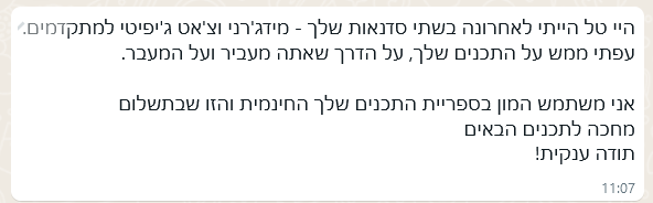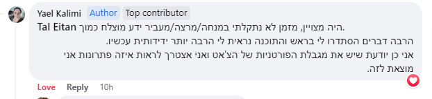 שימו לב שהרכישה אינה כוללת תמיכה אישית או טכנית. לשאלות בנושא חשבונות, מינויים ושאר עניינים מסוג הזה, אפשר לפנות לתמיכה של ChatGPT ולקבל עזרה אישית בהתאם לחשבון שלכם. אשמח לענות על שאלות ענייניות לגבי תוכני הסדנה, כמובן, ולעזור לכם להפיק את המיטב מהתכנים שאלמד. תוכלו להעלות את כל השאלות שלכם בקבוצת הפייסבוק (הפרטים יופיעו לאחר הרכישה).
