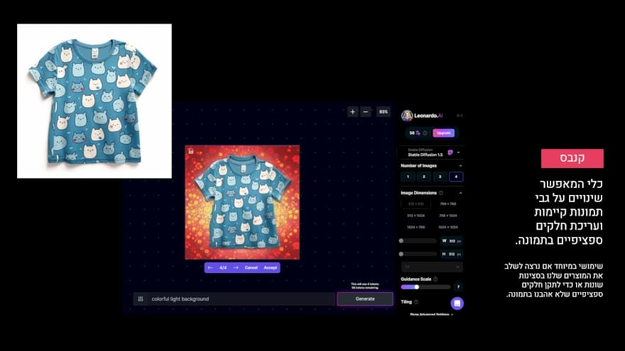 לאונרדו הוא כלי בינה מלאכותית המאפשר ליצור דימויים גרפיים רבים ומגוונים, איורים, תמונות, ציורים ועוד. אפשר לערוך תמונות, לשבץ מוצרים בסיטואציות שונות, ואפילו ללמד אותו לצייר בדיוק כמונו. ואם זה לא מספיק, הוא מציע גרסה חינמית נדיבה, המאפשרת שימושים רבים (כולל מסחריים).