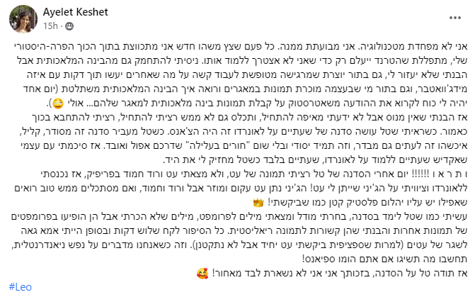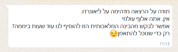 שימו לב שהרכישה אינה כוללת תמיכה אישית או טכנית. לשאלות בנושא חשבונות, מינויים ושאר עניינים מסוג הזה, אפשר לפנות לתמיכה של לאונרדו ולקבל עזרה אישית בהתאם לחשבון שלכם. אשמח לענות על שאלות ענייניות לגבי תוכני הסדנה, כמובן, ולעזור לכם להפיק את המיטב מהתכנים שאלמד. תוכלו להעלות את כל השאלות שלכם בקבוצת הפייסבוק (הפרטים יופיעו לאחר הרכישה).