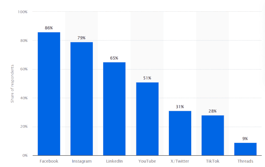 בסקר שנערך בינואר 2024 ובו השתתפו 1,915 בעלי/ות עסקים, ונמצא ש-86% מהם משתמשים בפייסבוק, 79% באינסטוש, 65% בלינקדאין ו-51% ביוטיוב: