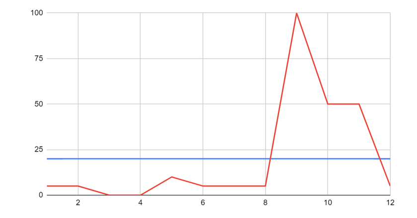 הבעיה עם הממוצע היא שהוא ממוצע. מצד אחד, מפתה להשתמש בו כי נורא קל לחשב אותו, כולנו למדנו בכיתה ג' או ד'. למשל, אם נחבר את מספר הפניות שיש לנו בכל ערוץ שיווק בחודש ונחלק את הסכום ב-12 (מספר החודשים בשנה), נקבל את ממוצע הפניות החודשי לעסק. העניין הוא שממוצע עלול להיות מבלבל. נדמיין שיש לנו שני עסקים, שבודקים בכל חודש כמה לידים הם מקבלים. ונניח שבעסק א' התקבל בכל חודש מספר קבוע של לידים, עשרים, אם לדייק. בעסק ב' היו תנודות, היו חודשים עם 5 פניות, היו חודשים עם 100. סידרתי לכם את זה מסודר בטבלה: