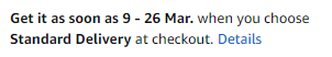 הגדרת טווח הזמנים בהם צפויה להגיע ההזמנה, עפ"י המוגדר מראש בפרופיל המשלוח בחנות, ועפ"י כתובת הלקוח, כמובן. ככל שהלקוח יקבל את המוצר מהר יותר, כך הסיכוי שהוא יבצע רכישה עולה, ולכן כדאי לשקול לשלוח את המוצרים שלכם למחסני אמזון להפצה מהירה בארה"ב, למשל.