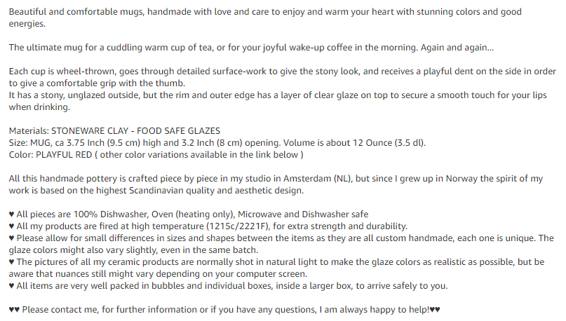 את מראה ועיצוב התיאור כדאי לשדרג משמעותית באמצעות תגיות HTML, שאם לא, הטקסט כולו יהפך להיות גוש אחד של מלל – במשפט אחד רציף (גם אם הפרדתם אותו לפסקאות, ירדתם שורה בסוף משפט וכו'). זו למשל דוגמא אינפורמטיבית ומעוצבת למשעי, מהחנות Kari Ceramics: