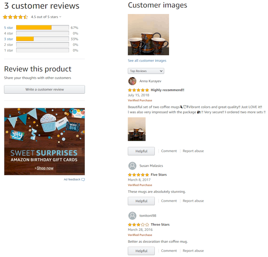 בחלקו התחתון של הליסטינג מופיעים Reviews של לקוחות, אם ישנם. זה קורה אוטומטית ואין מה לעשות שם יותר מדי (חוץ מאשר לעודד את הלקוחות לצלם את המוצרים בביתם ולהעלות תמונה, מה שמשפר משמעותית את ההוכחה החברתית ואת הנראות של החלק הזה בדף המוצר.